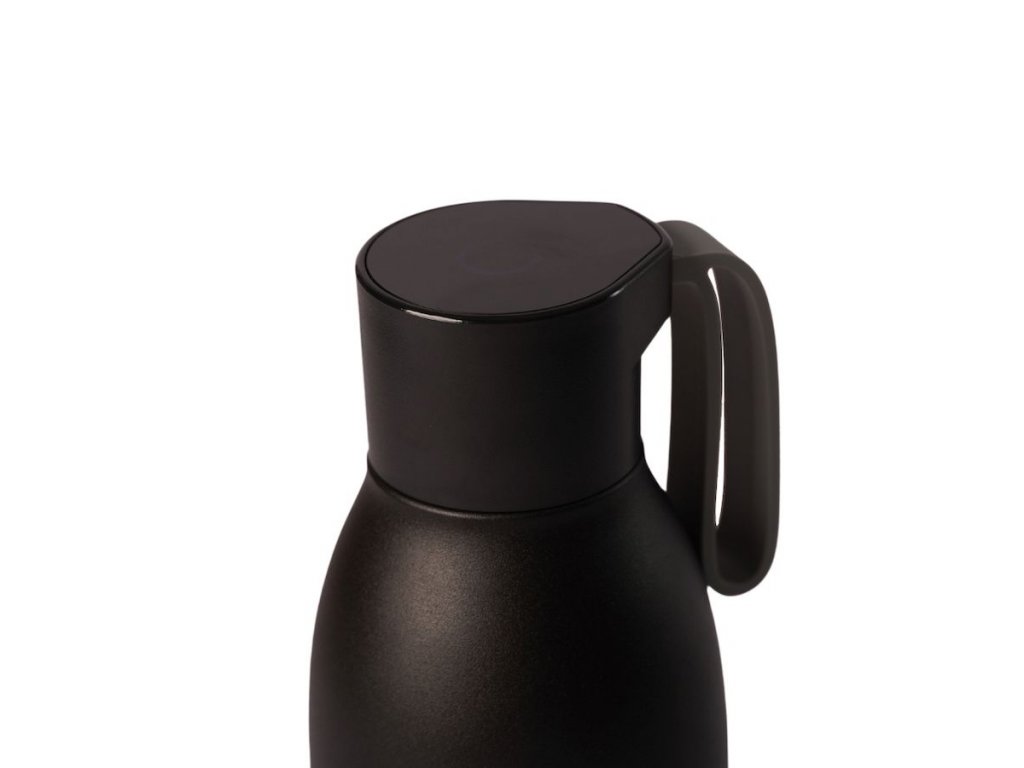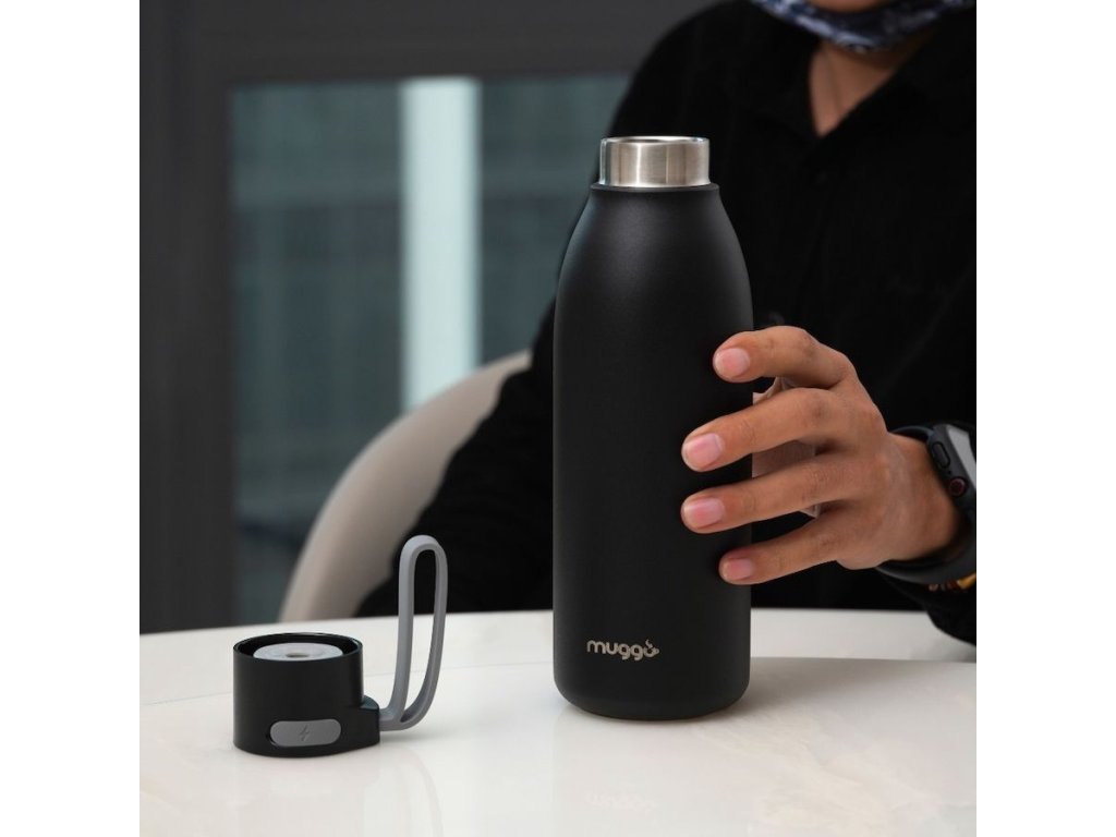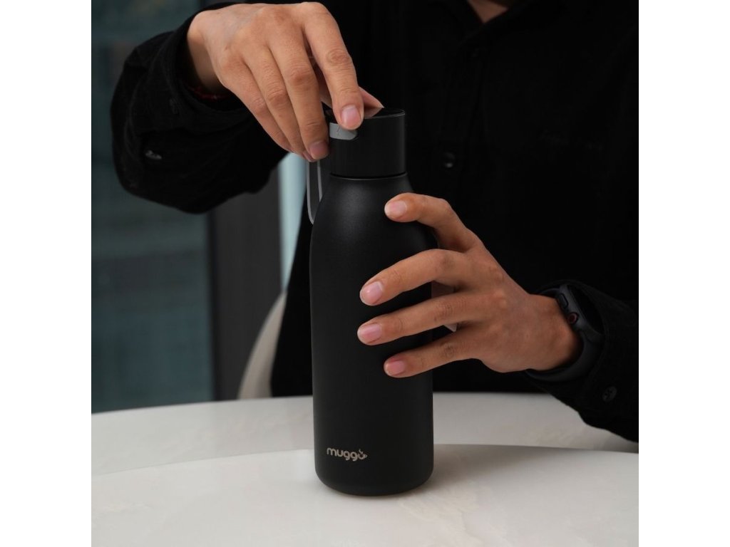 Termoska Muggo je ľahká, odolná a vyniká nadčasovým, minimalistickým dizajnom a kvalitnými materiálmi. Čierne telo termosky dopĺňa jednoduchý LCD displej, ktorý vás upozorní na čistotu vody a stav batérie pomocou modrého alebo zeleného podsvietenia. Intuitívne ovládanie displeja je jednoduché aj pre tých najmenších a praktický silikónový remienok na ruku vám umožní nosiť termosku všade so sebou bez toho, aby vám prekážala. Samozrejmosťou je najvyšší štandard utesnenia a odolnosti voči vode.